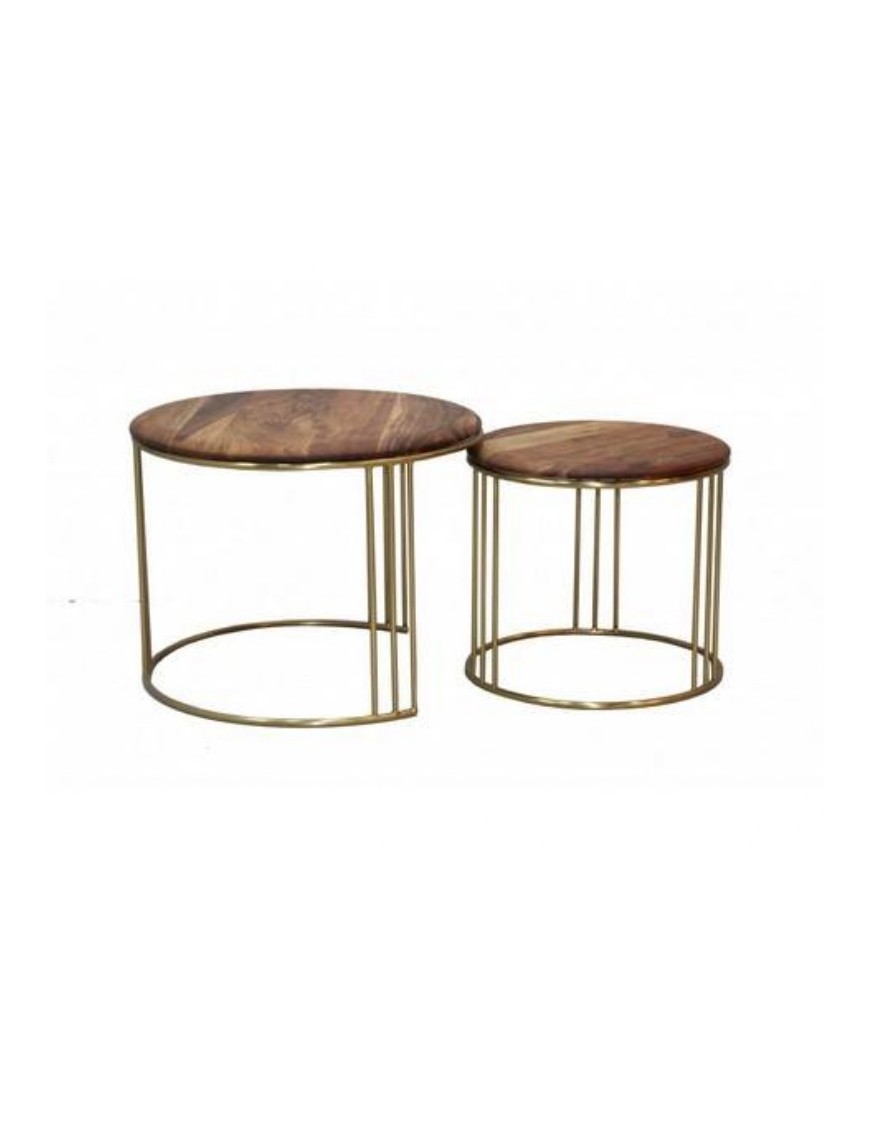 Lot de 2 tables rondes plateaux acacia massif diamétre 60 cm hauteur 46 cm et diamètre 40 cm hauteur 33 cm piétement métal doré