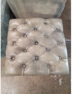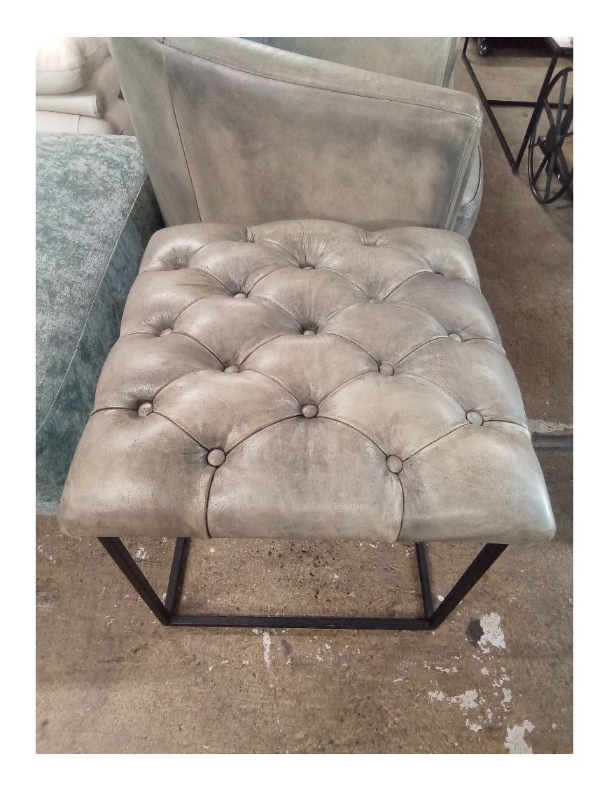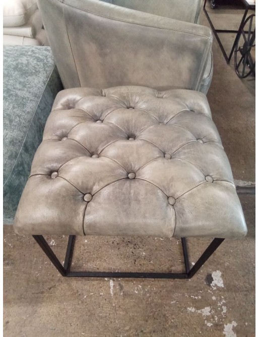 POUF CAPITONÉ CUIR GRIS PIÉTEMENT MÉTAL